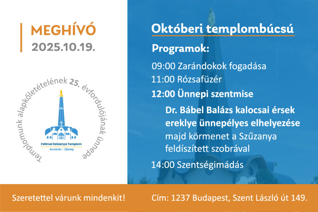 Szeretettel várjuk a zarándokokat az októberi templombúcsúra, a templomunk alapkőletételének 25. évfordulóján!